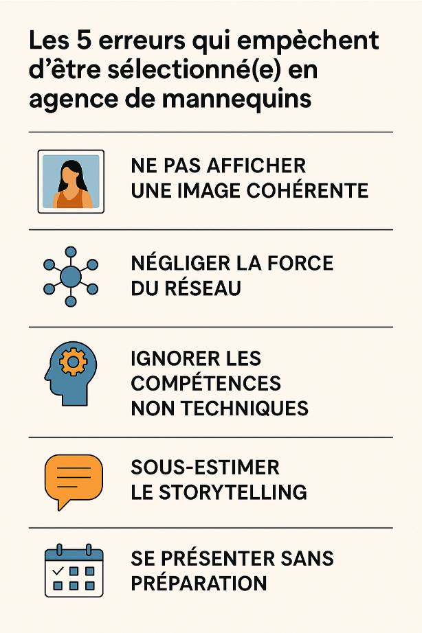 Votre book doit être à jour, avec des photos récentes et variées. Travaillez votre présentation : une lettre ou un mail clair, poli et professionnel en dit long sur votre sérieux. Le jour du rendez-vous ou du casting, soyez ponctuel, souriant et naturel. L’agence doit voir en vous non seulement un visage photogénique, mais aussi une personne fiable avec qui il sera agréable de collaborer.