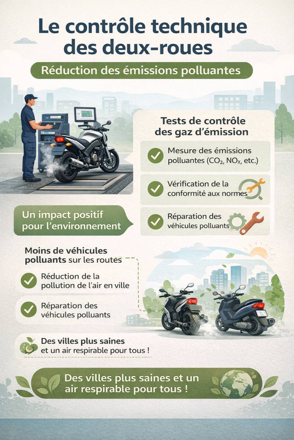 L’un des principaux objectifs du contrôle technique est la réduction des émissions polluantes des véhicules. Les motos et scooters émettent des gaz à effet de serre et d’autres substances nocives qui affectent la qualité de l’air. En s’assurant que ces véhicules respectent des normes strictes, le contrôle technique contribue significativement à la protection de l’environnement.